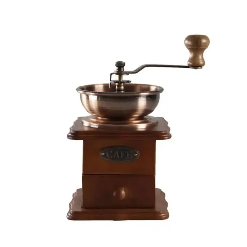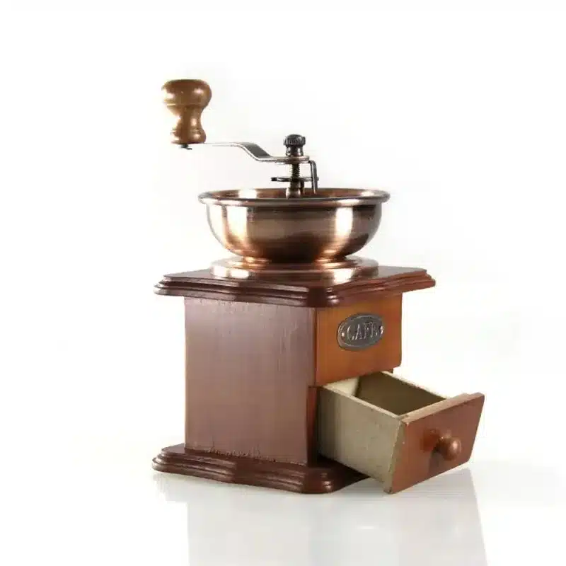 Voici l’ancien moulin à café en bois, une machine rétro à grains de café qui allie charme et praticité.