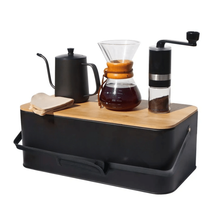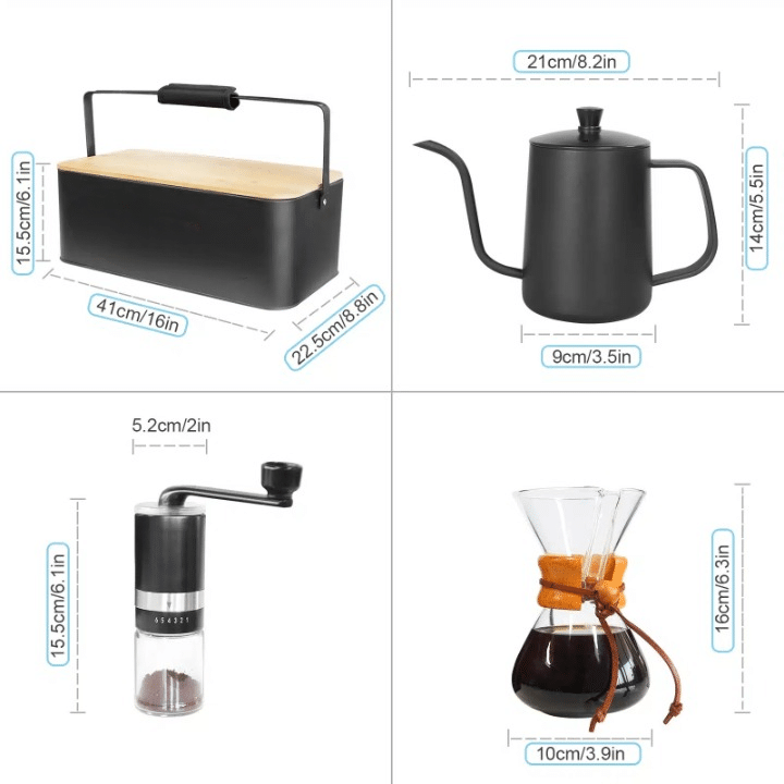 Cet ensemble complet en cinq pièces contient tout ce dont vous avez besoin : une bouilloire à café en acier inoxydable de 600 ml, un moulin à café, une carafe chemex, 40 filtres en papier chemex et une boîte en métal pour le rangement.