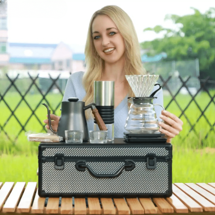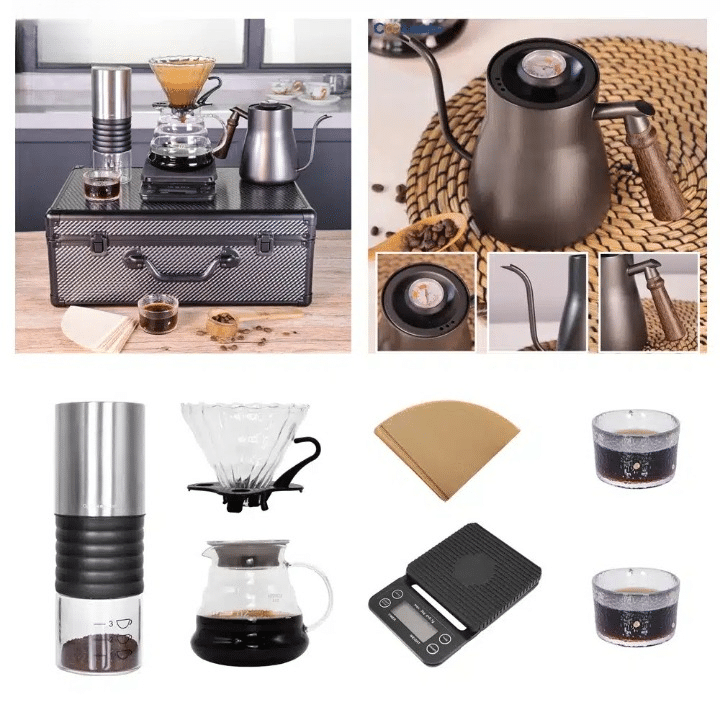 Cet ensemble tout-en-un comprend un moulin à café, une bouilloire à eau chaude, une cafetière et d’autres accessoires indispensables pour préparer un café parfait, où que vous soyez.