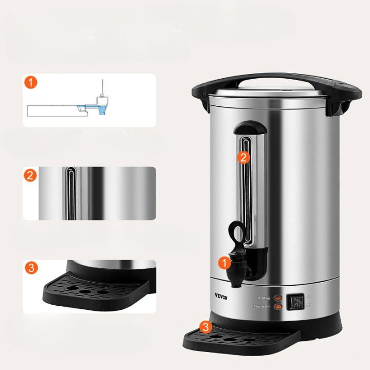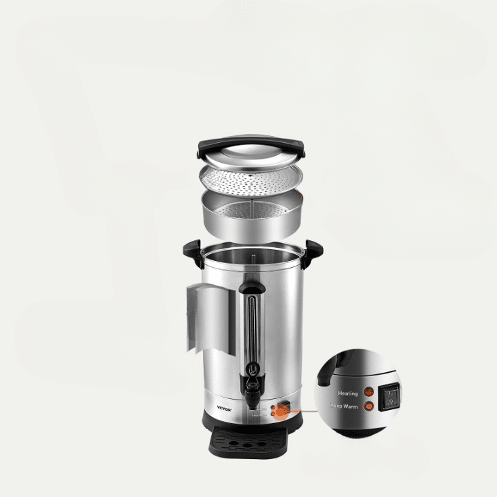 Fabriqué en acier inoxydable, il est non seulement robuste, mais aussi capable de préparer jusqu’à 110 tasses en une seule fois, parfait pour les grands événements ou les environnements professionnels.