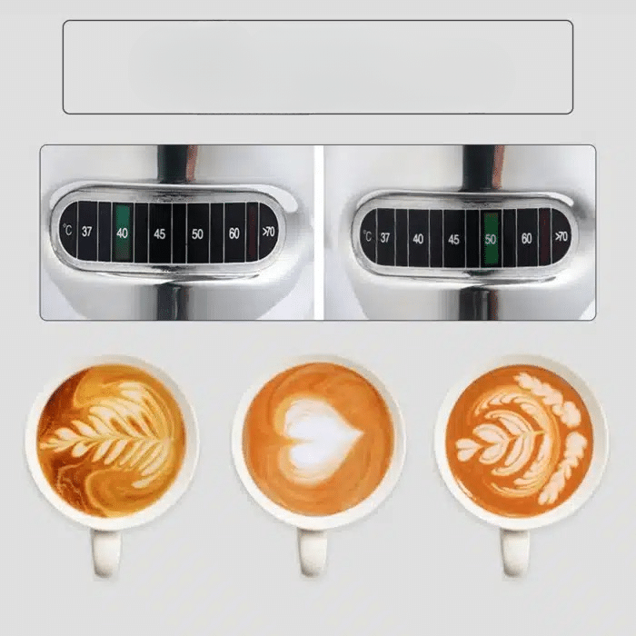Le thermomètre sensible réagit instantanément à la chaleur, t’aidant à éviter le lait brûlé et à obtenir une mousse idéale pour tes cappuccinos ou lattes.