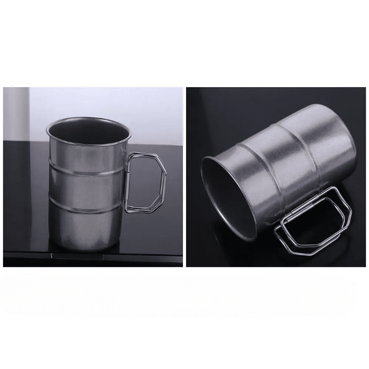 La tasse de camping à poignée pliante se distingue par son design industriel vintage en forme de tonneau d’huile, qui lui donne un look original et authentique, loin des mugs ordinaires.
